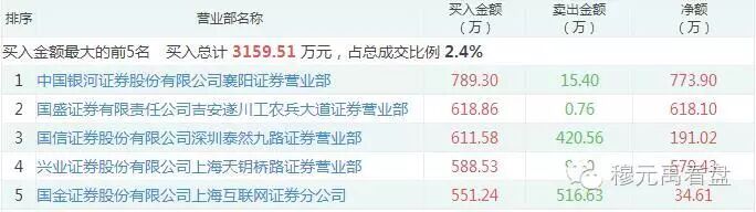 根据龙虎榜数据显示:中国银河襄阳证券营业部、国盛证券吉安遂川工农兵大道证券营业部、国信证券深圳泰然九路证券营业部、兴业证券上海天玥桥路证券营业部、国金证券上海互联网证券分公司分别大笔买入该股,买入总计3159.51万元,占成交总比例的2.4%。