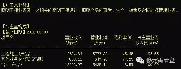 主营业务分析:该公司目前主要经营照明工程业务及与之相关的照明工程设计、照片产品的研发、生产、销售及合同能源管理业务。其中工程施工占到主营业务收入的93.66%。