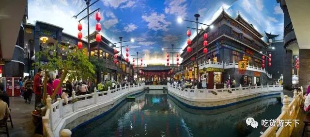 小宋城的综合营业区设置在一二层,整个营业区内以木质仿古建筑为主,回廊流水,亭台楼榭及戏台上传出的传统戏曲演唱声,仿佛瞬间把人带回了质朴又轻缓的北宋时代。抬起头,房顶喷绘的蓝天白云,加上周围小吃摊贩身上的古装,制作木板年画的老师傅纵横的皱纹,以及路边一排绣娘手中的银针,让来者一时忘忧。