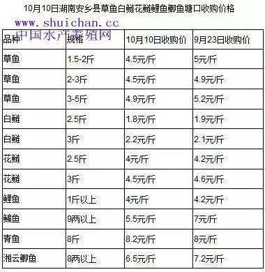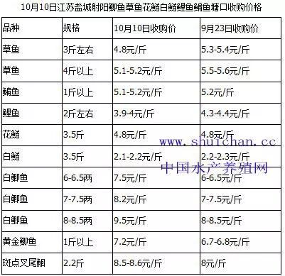湖南湖北鱼价都在下降,江苏一带也无法独善其身,对比江苏盐城射阳这两周的淡水鱼价格,所有淡水鱼品种全部下降,养殖规模最大的白鲫鱼价格跌的也是最凶的,草鱼鲤鱼有4-6毛钱的下降,花鲢白鲢鳊鱼黄金鲫价格稳定,存塘量不多的斑点叉尾鮰价格也跌到了7.5元/斤。从出鱼总量来看,这半个月射阳一带淡水鱼出鱼量呈现先增后减的曲线走势,国庆期间走量很大,无论是外地还是本地的水车都很活跃,节后出鱼量尽管有所减少,但是还比节前要大,后期出鱼量也会呈现整体增加的态势。从具体的鱼价来看,3斤左右草鱼收购价是4.8元/斤,4斤以上草鱼收购价是5.1-5.2元/斤,1斤以上鳊鱼收购价是5.1-5.2元/斤,2斤左右鲤鱼收购价是3.9-4元/斤,3.5斤花鲢收购价是4.8元/斤,3.5斤白鲢收购价是2.1-2.2元/斤,6-6.5两白鲫鱼收购价是5元/斤,7-7.5两白鲫鱼收购价是6.2元/斤,8-8.5两白鲫鱼收购价是7.2元/斤,1斤以上黄金鲫鱼收购价是6.8元/斤,2.2斤斑点叉尾鮰收购价是7.5元/斤。