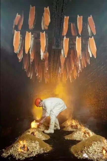 热熏三文鱼更接近我们印象中的“烟熏”,这也是美国最为传统的烟熏三文鱼的方法。先用盐、糖、香草和辣椒之类调配成的卤水腌制数小时,再用燃烧木头的烟熏到半熟。卤水的配方与木头品种的不同,熏制出来的三文鱼口味也不同。