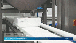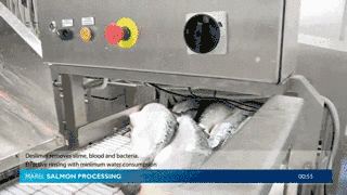 ◯ 第五,鱼肉已经进一步处理了,接下来就还是装箱前的最后一次清洗,保证我们可以吃到新鲜干净的三文鱼