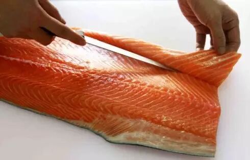 然后你就可以切三文鱼的鱼肉了,可以切片、切块,不过一定要顺着纹路才行。