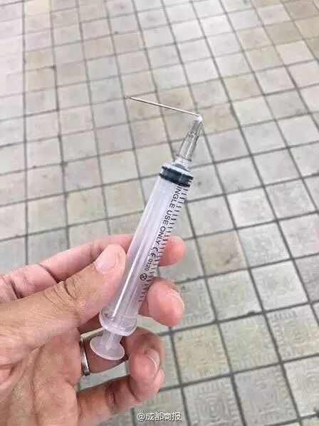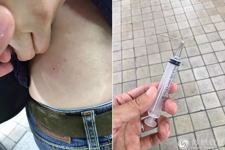 该网友表示,当时不少乘客在等电梯上高速列车时,电梯一打开,他第一个走进电梯,后面还跟著一名老妇,突然感觉到后背被尖锐的东西刺到,十分疼痛,以为是小偷,他立即转过头查看,只看到跟在他身后的老妇走出电梯,一个注射器掉在地上,女友想要上去追老妇,但被他阻止了,随后他便和女友带著注射器向列车站警员求助。