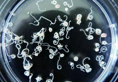 让人惊讶的是,这些“细线”居然是活物,一会伸直,一会又蜷缩成一团。 “这就是异尖线虫,我们这次对海鱼进行检测,就是找它们。 ”检验人员边说边将每条鱼腹腔中的异尖线虫分别放在不同玻璃器皿中。
