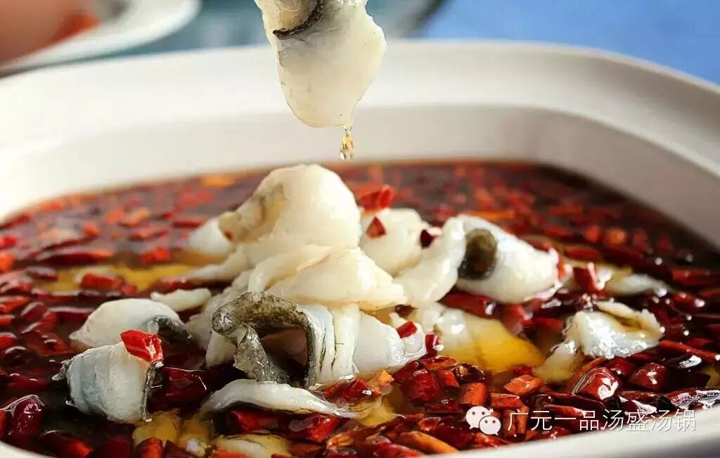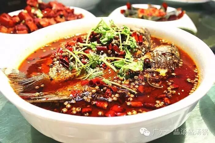 招牌“沸腾鱼”(沸腾鱼又称江水煮江鱼,以江团为主,是一道重庆市的汉族创新名菜,属于重庆渝北风味。最早流行于重庆、四川等地。看似原始的做法,实际做工考究--选新鲜生猛活鱼,又充分发挥辣椒御寒、益气养血功效,烹调出来的肉质一点也不会变韧,口感滑嫩,油而不腻。既去除了鱼的腥味,又保持了鱼的鲜嫩。满目的辣椒红亮养眼,辣而不燥,麻而不苦。“麻上头,辣过瘾”,让水煮鱼在全国流行得一塌糊涂)