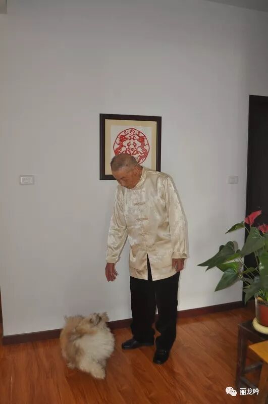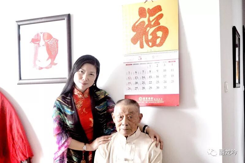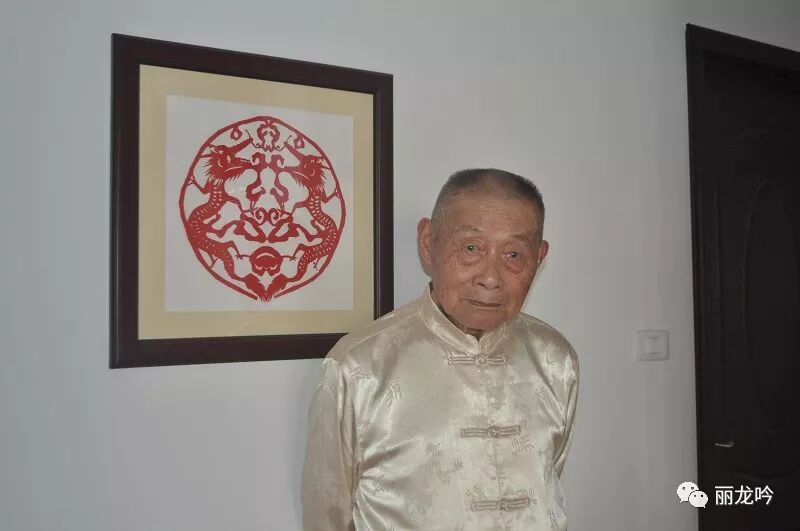 图为八十五岁父亲康复后在自己的剪纸艺术作品《双龙盘珠如意图》 前留影。