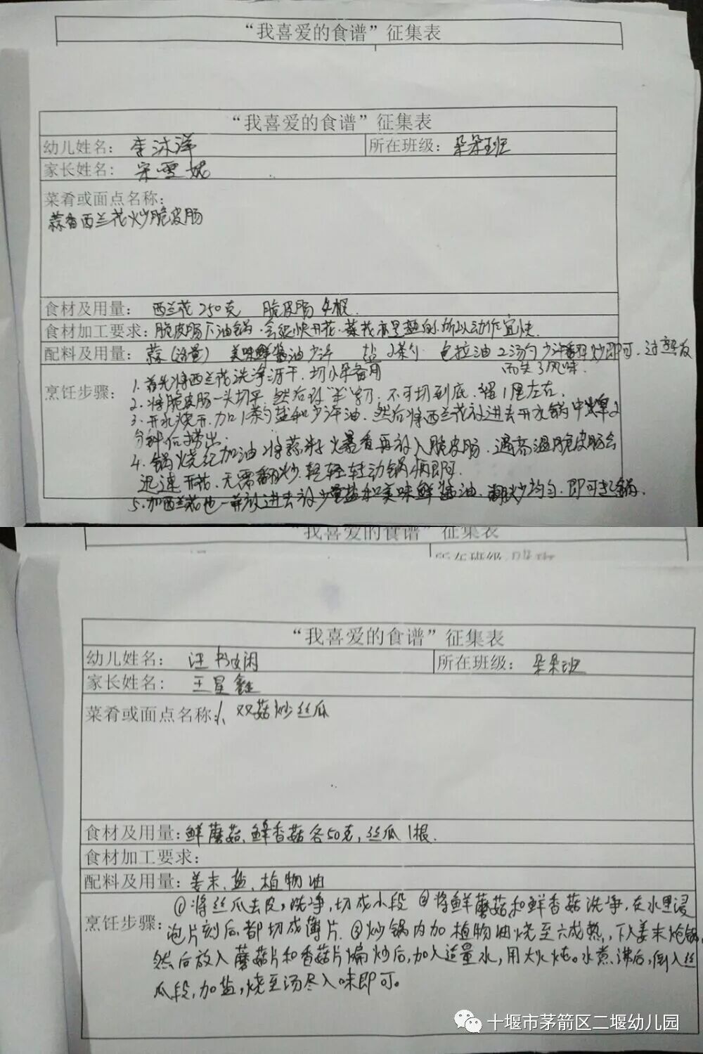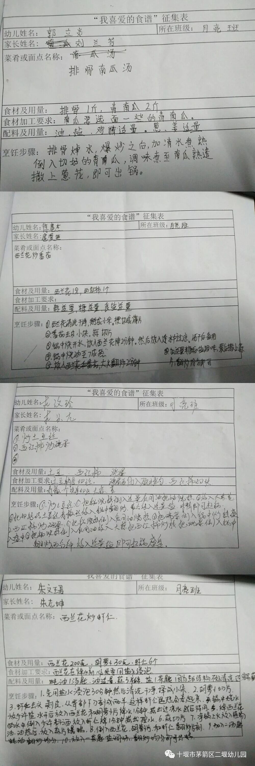 本次活动得到了家长们的大力支持,共收到食谱89份,大家纷纷推荐自认为营养全面、适合幼儿的食谱,并说明制作材料、制作方法、食谱优点等。幼儿园组织相关人员进行了仔细地阅读和认真分析,选出了25份适合幼儿园制作并适合幼儿的美食,包括炒菜、面点和粥类,其中很多美食我园都一直有安排。