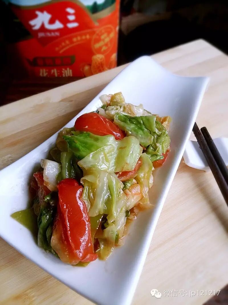 圆白菜 (少半个)、辣椒 (1个)、西红柿(小个) (2个)、九三非转基因花生油 (适量)、葱花 (少许)、蒜末 (少许)、鸡粉 (少许)