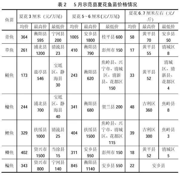 此外,大宗淡水鱼苗种价格存在区域性差异。示范县的大宗淡水鱼苗种最高价、最低价的分布情况具体见表1。而从鱼苗价格来看,这种地域差异更加明显。5月份各地夏花三种尺寸鱼苗大量上市,水花、冬片和春片鱼苗数量有所增加,主要集中在广东和湖北等地。从夏花鱼苗价格看,尺寸为3厘米的,以浦北县和资兴市的价格较高,宝坻区、静海县和清流县的价格较低;尺寸为5~6厘米的,以衡阳县和资兴市的价格较高,彭州市价格较低;而对6.7厘米规格而言,则以黄平县的价格较高,焦岭县和清城区价格较低。值得关注的是,目前各地夏花鱼苗的价格差距较大,价差多者甚至达到几百、上千元,详见表2。