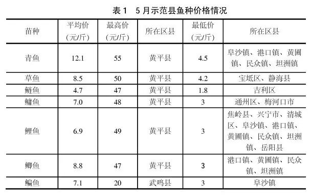 从61个示范县填报的塘边价格情况来看,5月份青鱼、草鱼、鲢、鳙、鲤、鲫、鳊鱼的平均塘边价依次为7.4元/斤、5.9元/斤、3.0元/斤、5.1元/斤、4.6元/斤、7.2元/斤和7.2元/斤。比较连续两月填报成鱼塘边价格的58个示范县后发现,5月份成鱼塘边价格涨跌互现,青鱼、鲢、鳙、鲤鱼价格环比分别下降1.02元/斤、0.06元/斤、0.17元/斤和0.05元/斤,降幅分别为11.8%、2.1%、3.2%和1.0%,草鱼、鲫鱼和鳊鱼价格环比分别上涨0.07元/斤、0.48元/斤和0.35元/斤,涨幅分别为1.1%、7.2%和5.1%。从环比趋势看,只有草鱼、鲫鱼和鳊鱼塘边价格变化趋势与批发价一致。与上年5月份价格相比(有效样本58个区县),成鱼塘边价格以下降为主,除鲫鱼和鳊鱼价格同比分别上涨0.28元/斤和0.56元/斤,涨幅分别为4.1%和8.3%外,青鱼、草鱼、鲢、鳙、鲤鱼价格同比分别下降0.73元/斤、0.62元/斤、0.36元/斤、0.69元/斤和0.88元/斤,降幅分别为8.9%、9.7%、10.9%、11.8%和16.0%。从同比趋势看,只有鲫鱼和鳊鱼塘边价格变化趋势与批发价不一致。大宗淡水鱼成鱼塘边价的最高值、最低值分布情况具体见表4。