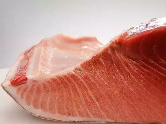 赤身是鱼背部的肌肉,脂肪分布最少,肉色呈现红黑色,算是金枪鱼身上最便宜的部分了。由于脂肪分布少,这部分味道无油脂香气,味道较酸,甜度微甜。口感上来说肉质比较平衡。