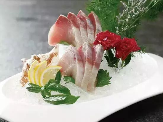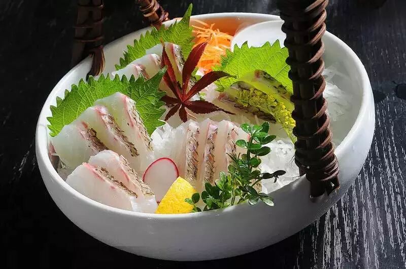 作为另一个最有档次的刺身代表,鲷鱼的味道也很好。鲷鱼刺身一般做成普通刺身或者松皮刺身。鲷鱼肉质比鰤鱼的肉还要透亮,而现在能吃到大多数所谓的鲷鱼刺身其实是罗非鱼做的,鱼肉相对来说偏白,不那么透亮,从这一点可以分辨是不是鲷鱼。鲷鱼肉质非常富有弹性。鲷鱼鱼肉的味道不酸,带有淡油脂香味,油脂香味不如鰤鱼重,甜味也是不如鰤鱼,微甜。