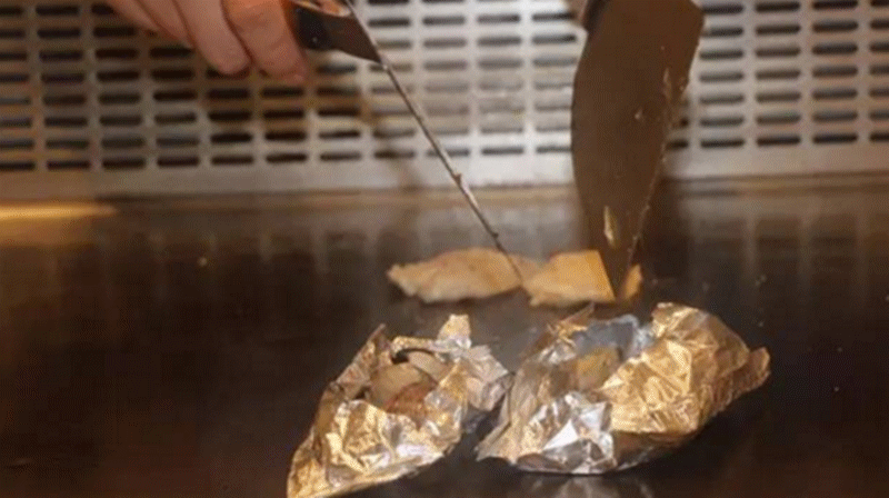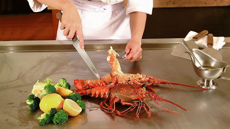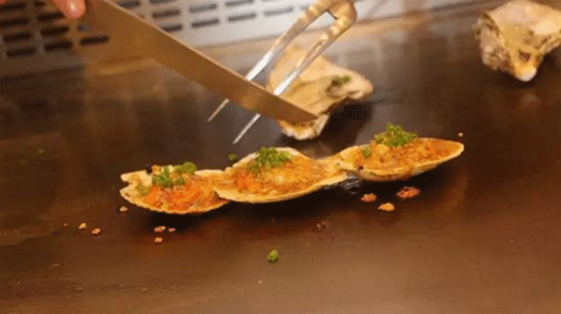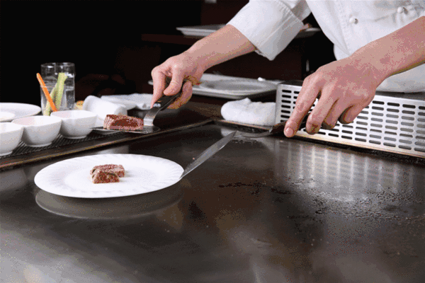 把后堂搬到铁板上,从切、配、盛盘、装饰及一切烹饪技艺,都展现在客人的面前,这或许就是铁板烧的魅力吧!