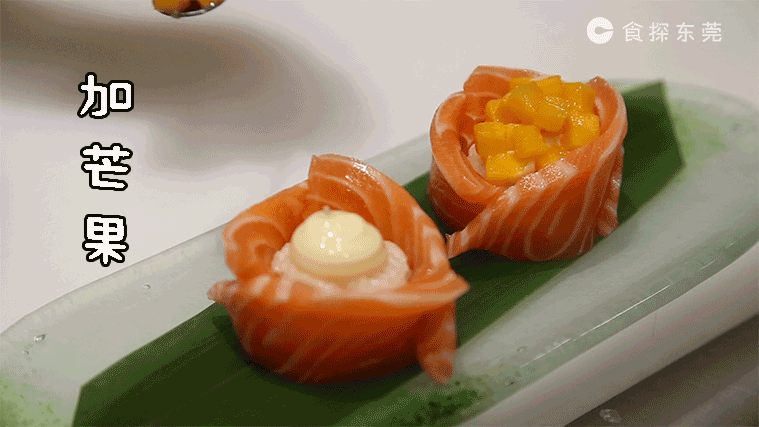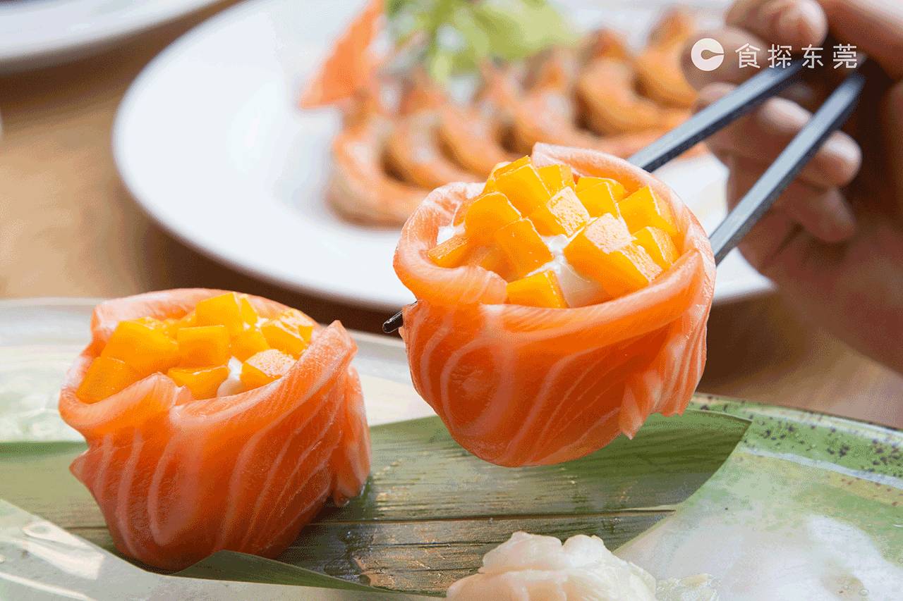 芒果粒花蕊搭配三文鱼,口感多了一份新鲜清甜~夹起来就能感受到它的重量!老板是真的大方!