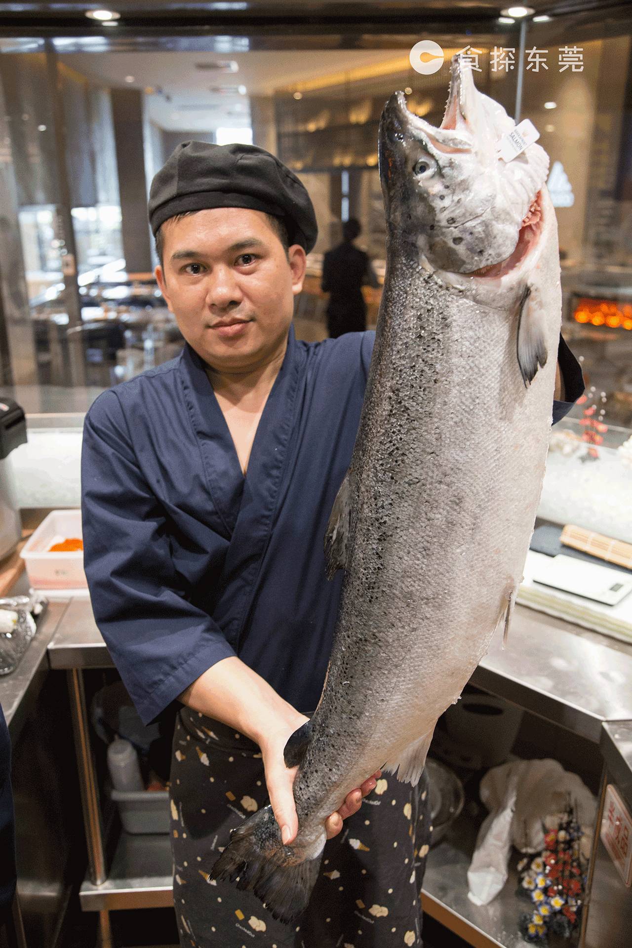十几斤重、米半长的三文鱼,师傅举起来都有点乏力!来自法罗群岛的它,体侧扁、背部隆起、齿尖锐、鳞片细小...不说了总之看样子就知道好吃!