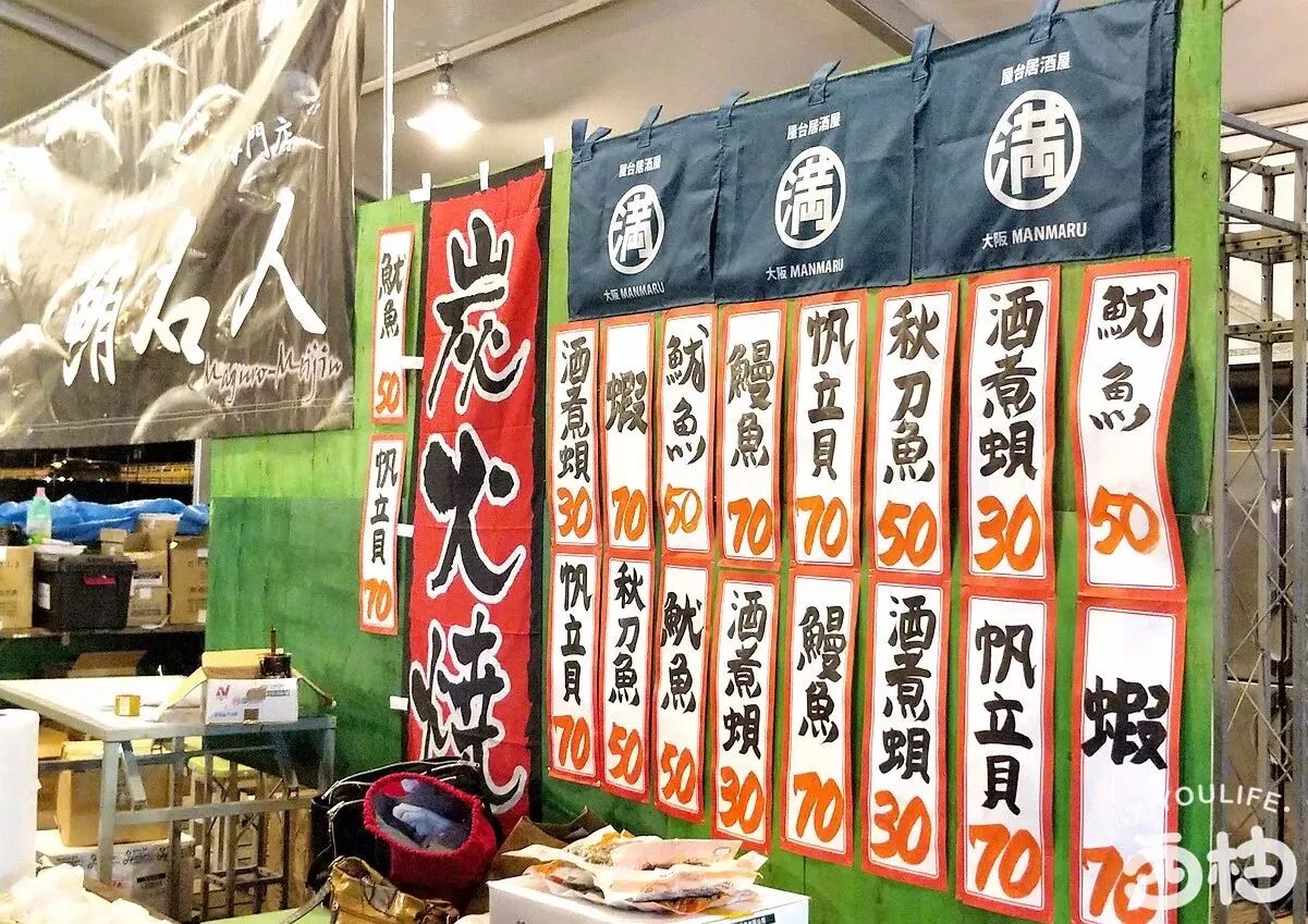 超有氛围的海产市场,还会有小姐姐小哥哥出来用日语吆喝你过来,走到这里就让人忍不住嗨起来的激动,空气弥漫着的烤物香气,更是迷得人神魂颠倒。