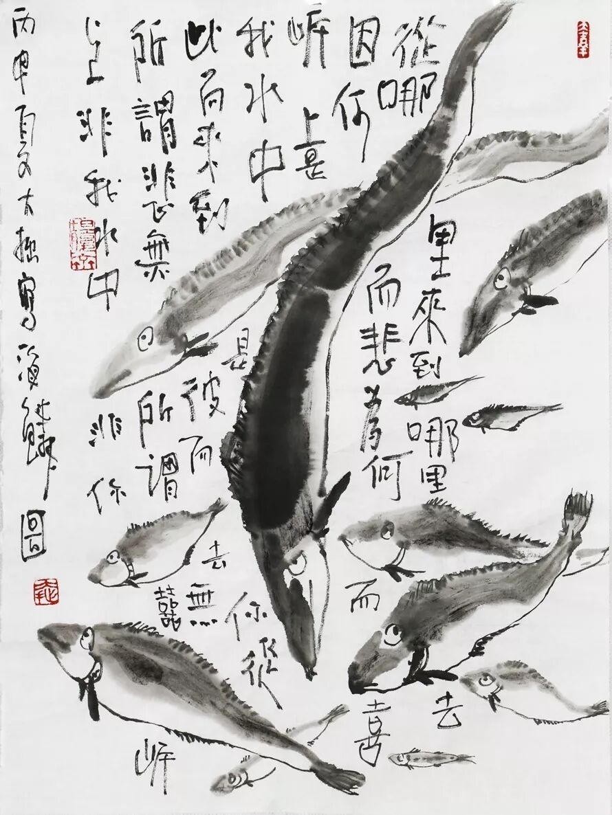 你是浩瀚海中一只鱼,我是茫茫人海里一个人,我画鱼好似庄生梦蝶,又象问鱼之乐。庄子被一只蝴蝶搞晕了,这一群鱼儿也未能让我明白。实际上大多数道理问到最后就说不清了,说的明白的都是些简单的事情。你看《道德经》这些可称为“经”的言论,哪些是一清二白的?或者特别深奥的道理,就像灵光一闪,却又稍纵即逝,伸手去抓,以为就在拳里,摊开掌心,里面却空空如也。有人说“人类一思考,上帝就发笑。”可能人的根器就这么深了,思考什么呢?这就像一个大力士非要拽着自己的头发把自己提起来,不是你没有力气,而是你注定完不成这个任务,战胜不了自己。人类在终极真理面前只有气馁而已,自己号称掌握真理的人不是骗子就是傻子。