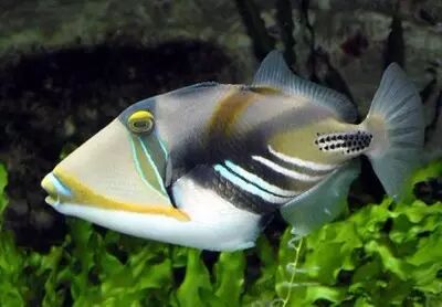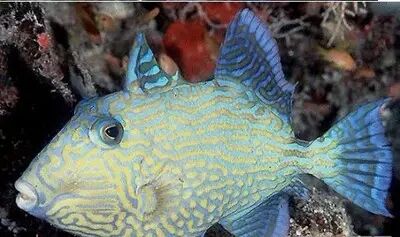 有一个古怪,像画上去的外表。茶色的身体暗色的斜纹,头部是蓝色及黑色条纹,黄色条纹从嘴部延伸到腮部。350升以上水族箱饲养,带活石或洞穴供其居住。它会重新整理一下石头,以供其进出洞穴方便。它会发出“咕咕“的声音。非常可爱的一个品种。需要提供各种动物性饵料,包括:鱿鱼、虾、贝类、小鱼及硬壳虾帮助其磨磨不断成长的牙齿。