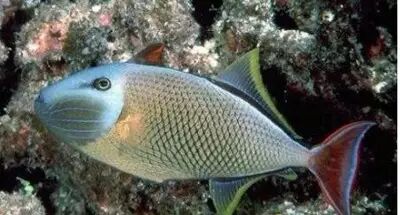 也叫粉尾炮弹。有一个非常漂亮的翡翠绿色的身体,一个亮粉色的尾巴。背鳍及臀鳍也是带粉红色,嘴部及胸鳍为黄色。350升以上水族箱饲养,带石头将会是很好的环境。注意,可以放入珊瑚缸,但会吃掉任何碰到的甲壳类动物及小鱼。需要提供各种动物性饵料,包括:鱿鱼、虾、贝类、小鱼及带壳的虾帮助其磨磨不断成长的牙齿。
