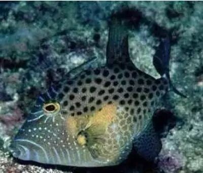 也叫黑斑炮弹或布尔萨。黄色的身体,带着小的胡须,眼睛覆盖着美丽的条纹。在腹部有一个明显的黑斑。350升以上的带石头及洞穴的水族箱饲养。它会把石头重新排列。会发出“咕咕“的声音。需要提供各种动物性饵料,包括:鱿鱼、虾、贝类、小鱼及带壳的虾帮助其磨磨不断成长的牙齿。