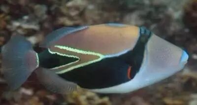 也叫v字炮弹,蓝黑色条纹贯穿眼部。明显特征为身体上有一个黄色的V字形。280升以上水族箱饲养,最好带石头及洞穴。它会把石头重新排列。会发出“咕咕“的声音。需要提供各种动物性饵料,包括:鱿鱼、虾、贝类、小鱼及带壳的虾帮助其磨磨不断成长的牙齿。