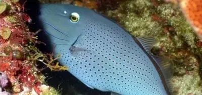 也叫蓝腮炮弹,或镀金炮弹,灰褐色身体覆盖着亮蓝色的斑点。各鳍边是黄色的。雄性个体有一块蓝色的大斑在腮部,因此叫做蓝腮炮弹;而雌鱼没有。350升以上水族箱饲养,最好带石头及洞穴。它会把石头重新排列。它会“说话“,实际上是发出的咕咕声。需要提供各种动物性饵料,包括:鱿鱼、虾、贝类、小鱼及带壳的虾帮助其磨磨不断生长的牙齿。