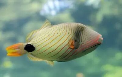 也叫橙纹炮弹、波纹炮弹、斜纹炮弹。有一个非常吸引人的,翡翠绿色的身体,带着橘黄色的水平条纹。300升以上水族箱饲养,给其石头建洞穴最好。它会把石头重新排列。会发出“咕咕“的声音。非常易养,但对其他鱼据有攻击性。需要提供各种动物性饵料,包括:鱿鱼、虾、贝类、小鱼及带壳的虾帮助其磨磨不断成长的牙齿。