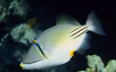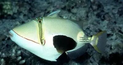 身体和头部有很厚的鳞,在眼睛前面有很深的凹槽。颜色比较鲜明,鳞片有深色中心点。鳃部及身体靠近尾部为白色带一些黄色。背鳍和臀鳍有黑色外边。应该说是最大的炮弹类鱼,能达到75厘米。当保护自己巢穴时异样凶猛,1997年Randall报道,有三个划船的人被这种鱼袭击过。不要放在珊瑚缸里,会把无脊椎动物及珊瑚全部消灭。可以饲喂各种动物性饵料,提供贝壳类、带壳虾供其磨牙。