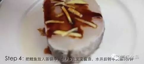 ④ 把银鳕鱼放入蒸锅中,倒入2克宝宝酱油,水开后转中火蒸5分钟。