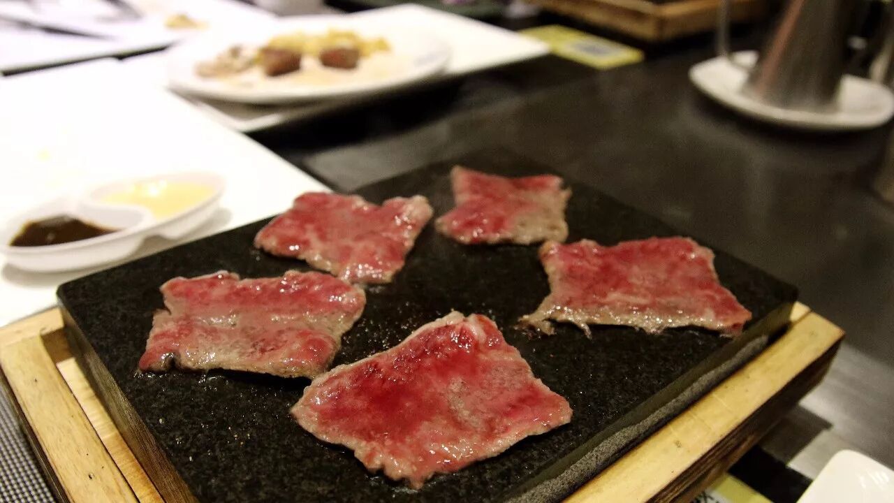 互动感很强的一道料理,放点油涂开,再把牛小排放到高温的岩石上炙烤,好玩又好吃,还可以依据自己的喜好加盐加胡椒粉。