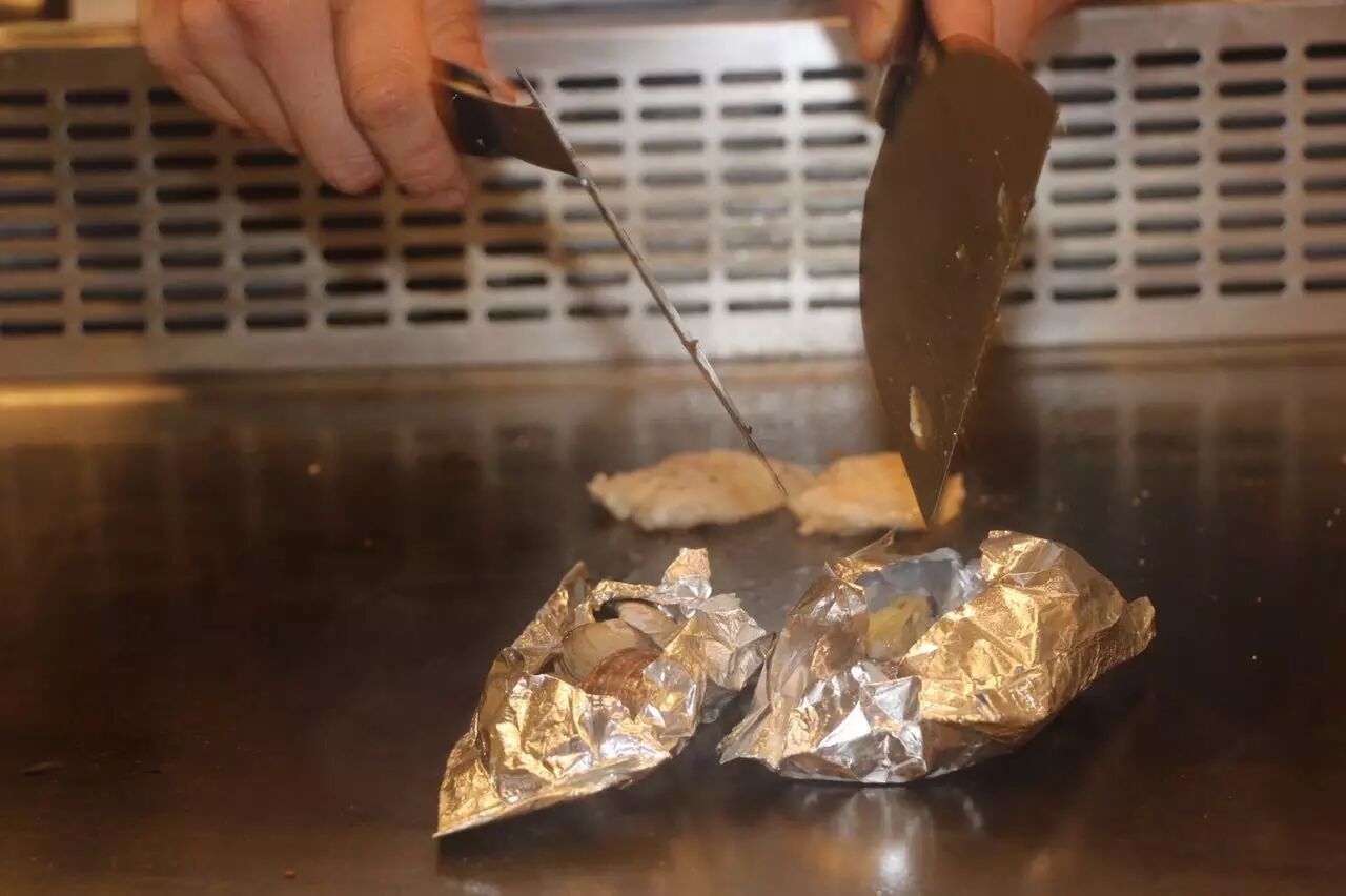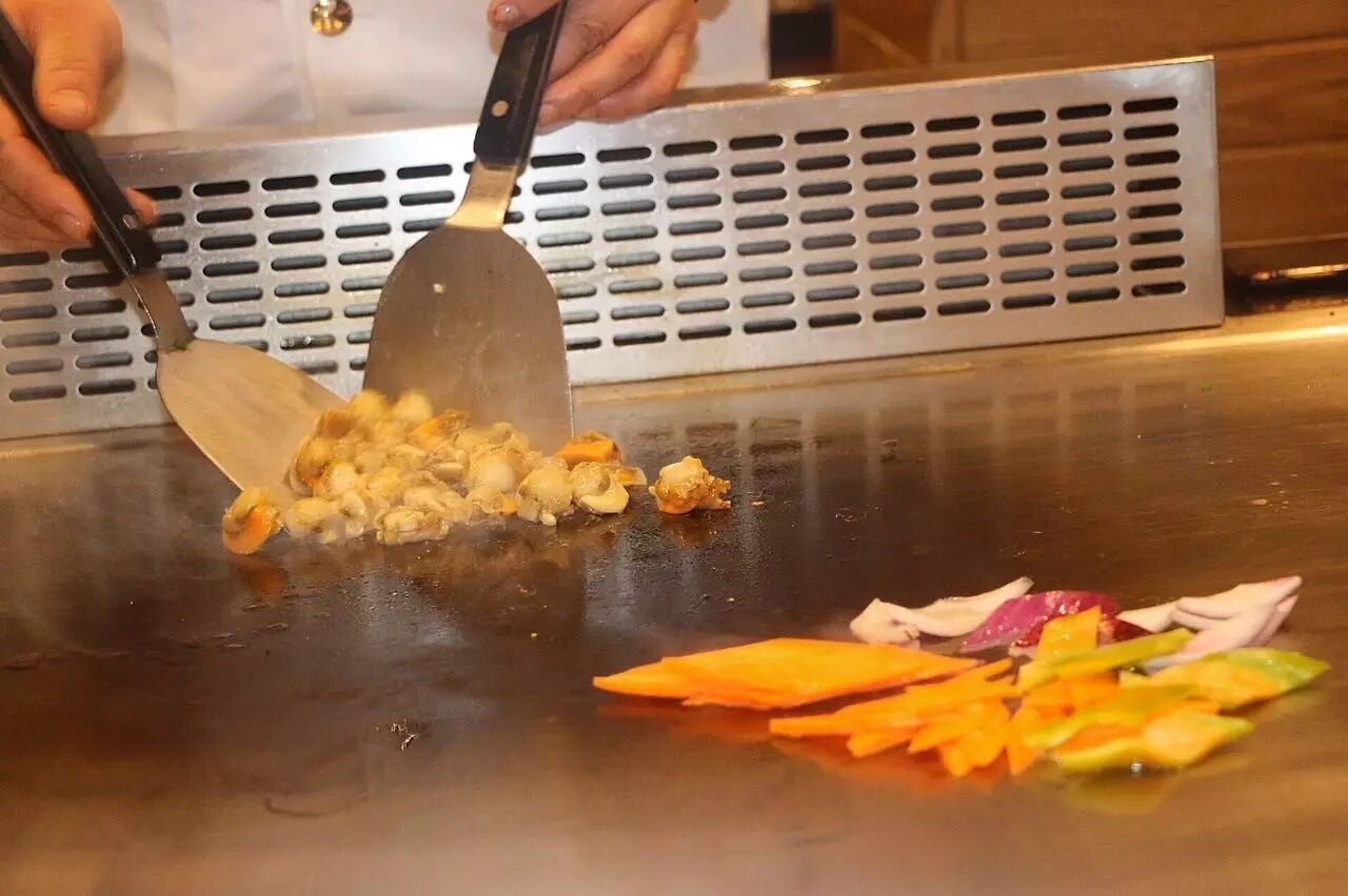我们坐在香香的铁板烧台旁边,看厨师煎各种好吃的。。。