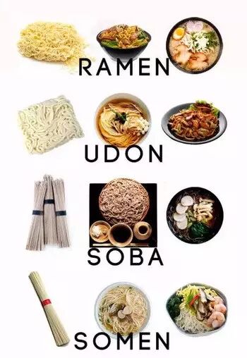 拉面:源于中国上海和广东的面条,但是刀切而不是拉成的,音为“拉面”或许是讹传。另外,日韩的方便面也经常被这样叫。日式拉面大多是汤面,搭配不同风味的浓汤和配菜。