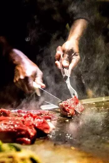 铁板烧顾名思义,就是在一张烧烫的大铁板上迅速煎烤食物,但必须由经验丰富的厨师操作。因为食材上至高级牛肉、海鲜,下到蔬菜、炒饭、煎饼,需要的火候和熟成度各不相同,想要快、狠、准地用高温热油封存住食物的鲜嫩口感,得有娴熟的技巧。也因此,食客观赏现场制作的铁板烧,成为日本料理的又一特色,又因不能回锅重新加热,又称“即席料理”。