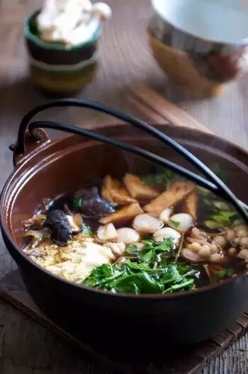 日式火锅多使用厚重的铸铁锅或砂锅,通常先熬好汤底,略煮菌菇豆腐等底料之后,放入肉类、海鲜和青菜,边煮边蘸酱吃,经典的蘸酱是