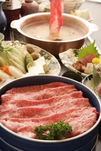【寿喜烧】:早期寿喜烧的主料是鸡肉,因而称鸡素烧,明治维新之后才渐渐流行牛肉。与寿喜“锅”不同,寿喜“烧”要先把牛油均匀涂在浅口锅底,然后烤牛肉片,待肉微熟后撒上白糖,等白糖渗入肉汁中再浇酱油和味啉,或是柴鱼高汤,最后搭配蔬菜豆腐菌菇稍微焖煮。寿喜烧的蘸料是新鲜的生蛋液,鸡蛋只需搅拌“九又二分之一”下即可食用,这样才好最大限度地保持蛋清的粘稠口感。