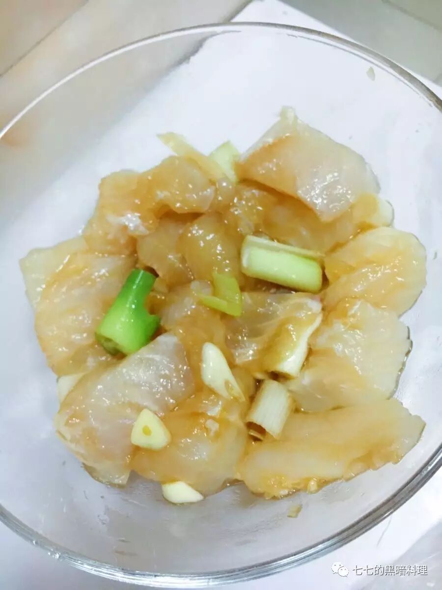 先把鱼切块块(因为上次煎成沫沫了 这次切了大一点的块儿) 放葱姜蒜 料酒腌制(菜谱上还有淀粉 我没有)淹了大概二十分钟 估计久一点会更好