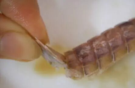 1. 把尾部最外面两个小脚拧断,然后捏着尾部轻轻往上一折,再拧掉。
