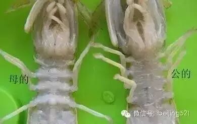 脖子上带白色“王”字的是母的;虾爬子第三对足各有一只小腿的为公;母的形体较小,脖子较细。