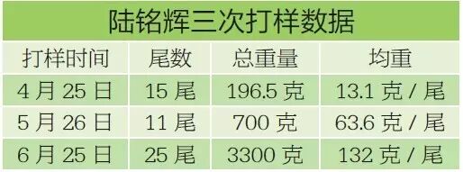 今年第一次养罗非鱼,而且一次性投苗8万尾,饲料用量可不小。他开始特别重视饲料投喂效果。在江门汇海业务员詹地检的引导下,他坚持打样称鱼。因为打样能够产生直观效果,除了两次与詹地检共同打样,陆铭辉自己还打过一次样。