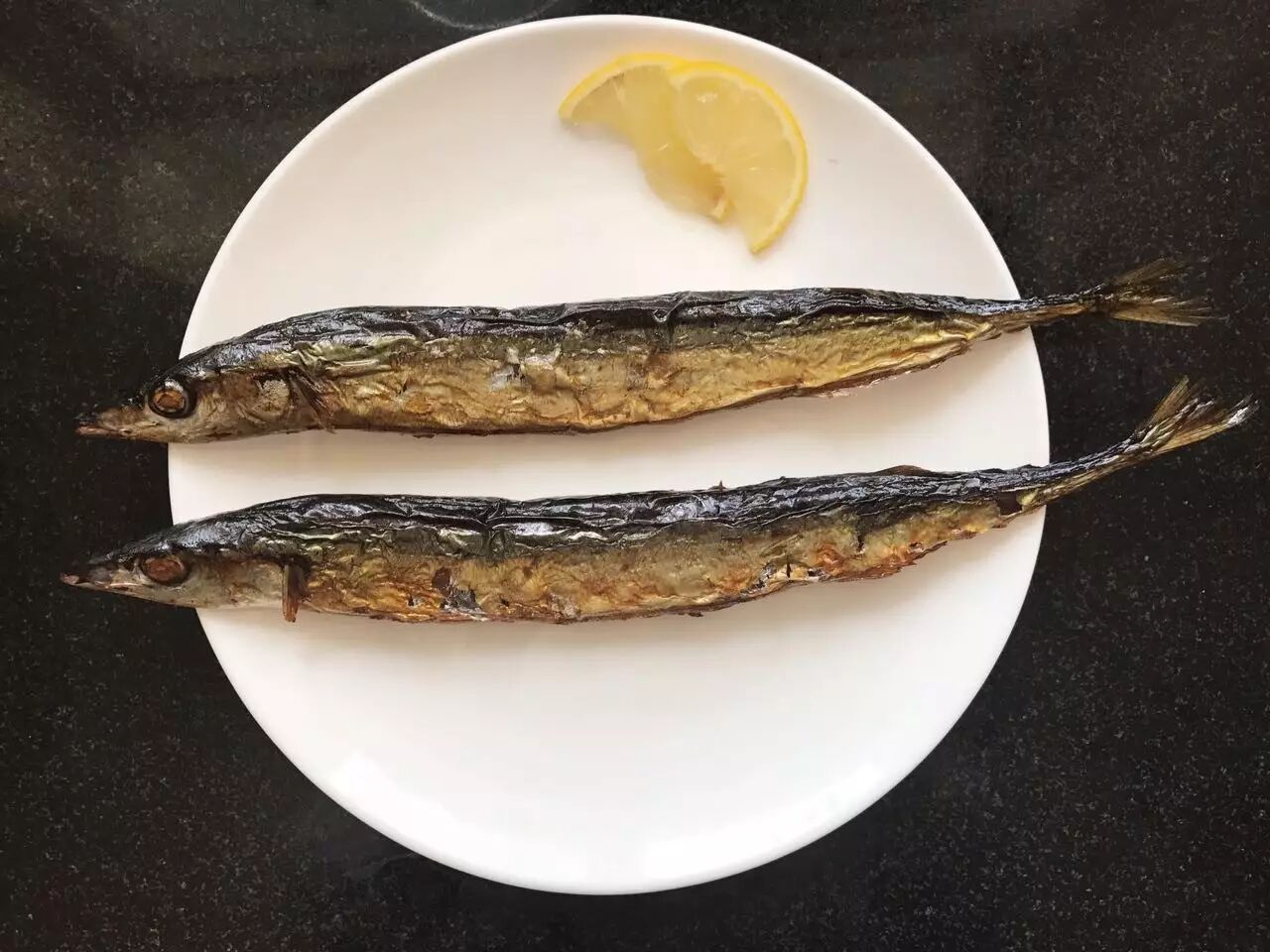 Step5:将烤好的秋刀鱼盛出,挤上柠檬汁,即可食用。