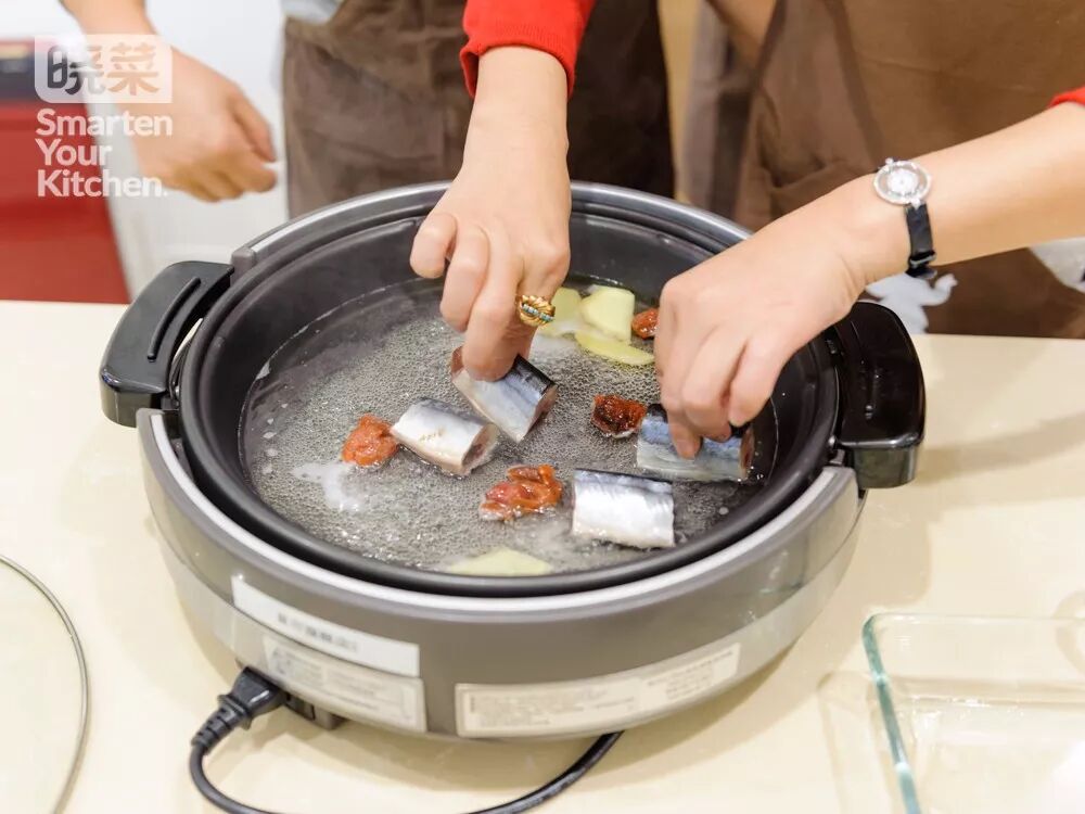 3)将姜片、日本梅子、白砂糖、淡口酱油、盐、水和秋刀鱼分别加入煎锅中,将烹调纸剪至锅子大小,盖在鱼上,温度调至180,煮20分钟左右。