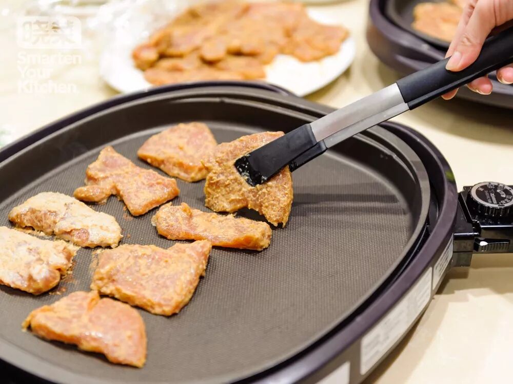2)将象印煎烤机温度调至140,放入腌制好的猪里脊,为防止粘底,请随时翻面,烘烤至表面金黄色即可。