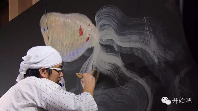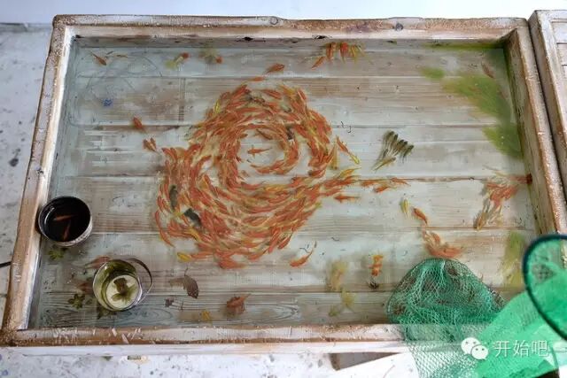 也不再满足于单只金鱼树脂画的创作,开始尝试游弋的鱼群。很多个深夜,深堀隆介还在工作室就着灯光埋头创作。