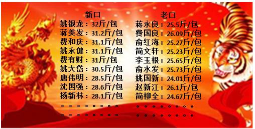 徐阿毛:29.8斤/包;施电华:33.08斤/包;曹祥吉:31.8斤/包;章建根:34.8斤/包;章建根:33.4斤/包;蒋水龙:30.4斤/包;王慧章:30.7斤/包。姚民新:30.46斤/包;张斌权:30.4斤/包;杭根法:29.8斤/包;徐文初:29.2斤/包;钱国卫: 29.6斤/包:沈荣新:30.65斤/包。。。。。。。。。。