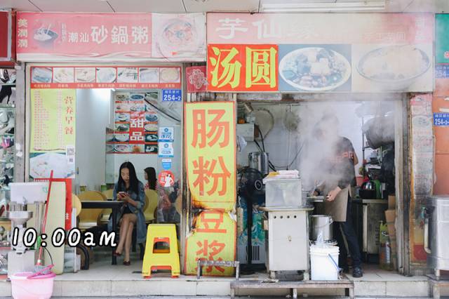 小店门口总是冒着一缕缕的炊烟,隐约间可以闻到潮汕砂锅粥的香味,听到有节奏感的鸡蛋壳敲击声,让人不小心忘记马路外面忙碌的人群,愿意停下来歇息一下。