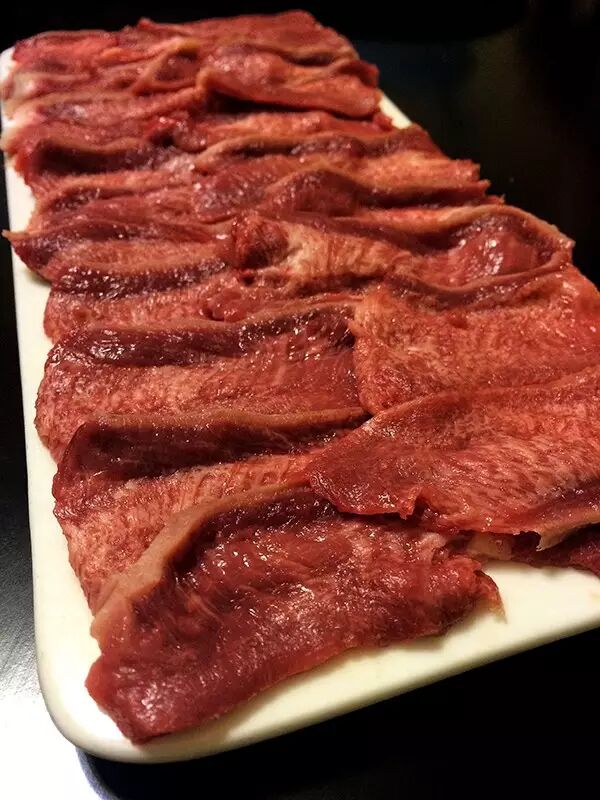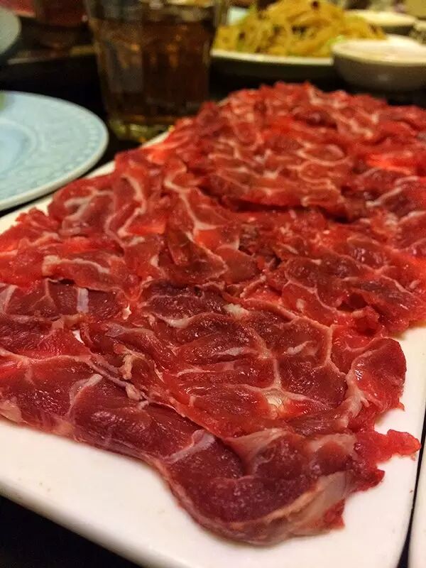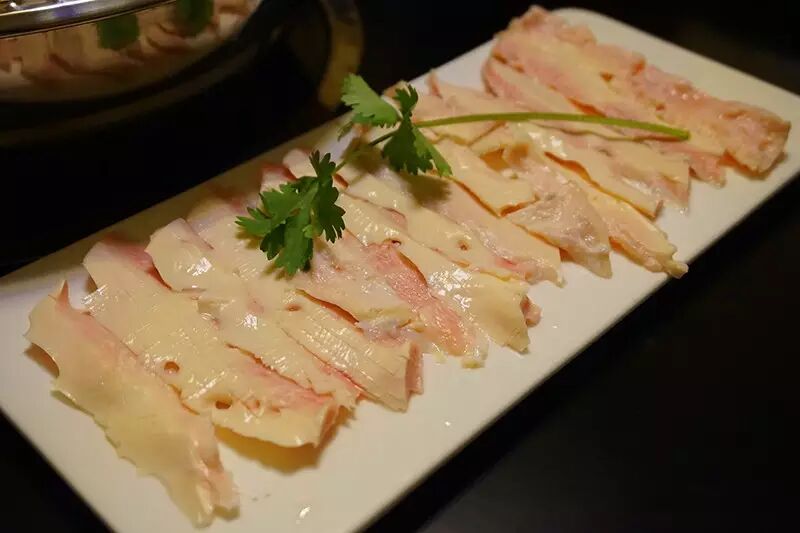 黄中带白的牛胸肉,只有身材高大、肥硕的牛才有,也因此十分难得。胸口酪的酪(lāo)是脂肪的意思,但是胸口酪并不是脂肪,而是一种软组织。胸口酪涮熟后,脆而爽口,韧劲十足,带着油香,却并没有肥腻之感。