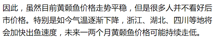 广东佛山南海鱼中梁老板告诉《农财宝典》记者,近期浙江黄颡鱼大量上市,价格比广东地区还低,将不可避免影响广东的鱼价。同时,最近黄颡鱼消费市场疲软,流通市场走弱,加上广东南海新鱼将在12月份开始上市,价格走低已经成为定局。
