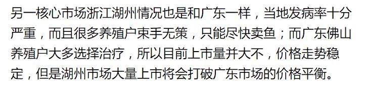 据悉,由于黄颡鱼去年和今年初价格行情走强,今年广东市场养殖量总体增加2-3成左右,不过目前广东核心养殖区佛山市场大鱼存塘量较少,今年新鱼头批鱼较少,目前头批鱼炮头头只有3两左右,加上最近转季,黄颡鱼吃料减慢,病害主要爆头,出血、肠炎等病害高发期,而且佛山市场养殖户习惯养殖炮头至5-6两,因此,估计到时新鱼上市量可能并不大。