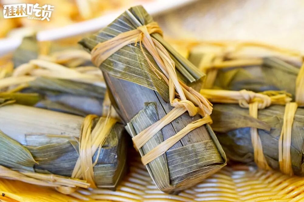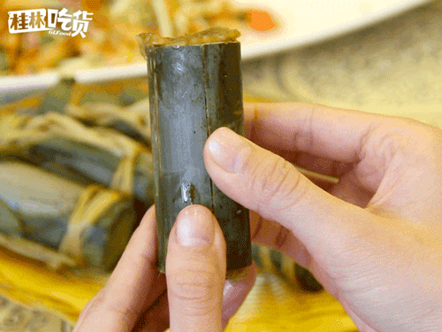 所有的材料炒制后塞入竹筒里,裹上粽叶